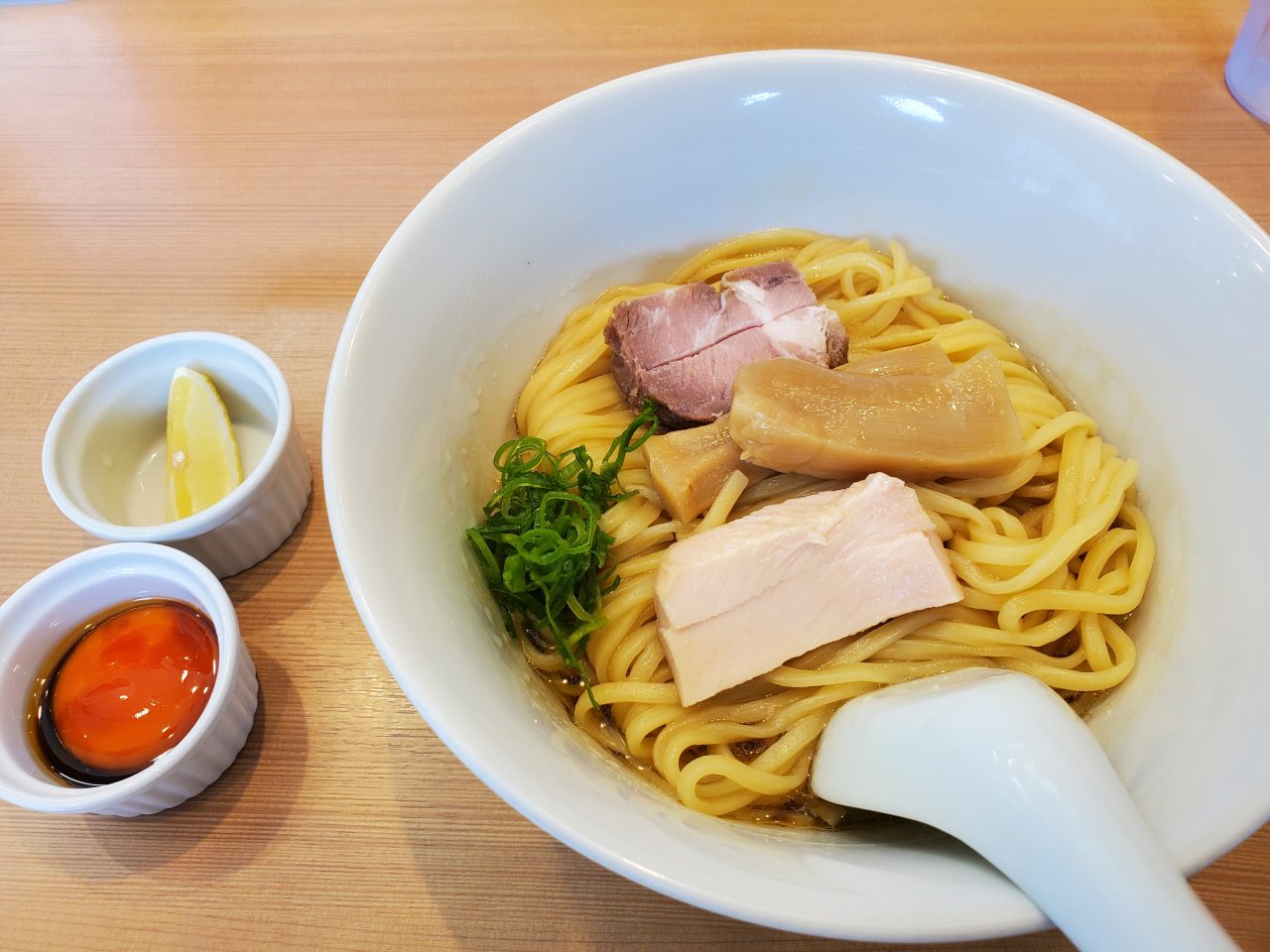 魚介の香り高い風味がするスープと、よく味が絡んだ細い麺。